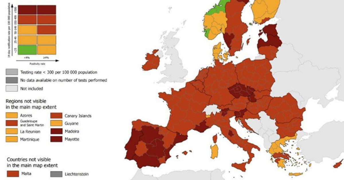 Την ίδια στιγμή το μεγαλύτερο κομμάτι της Ευρώπης όπως φαίνεται και στον παρακάτω χάρτη βρίσκεται στην πορτοκαλί ζώνη που σημαίνει πως έχουν 150 ή περισσότερα κρούσματα ανά 100.000 κατοίκους. Όσες περιοχές έχουν βαφτεί με σκούρο κόκκινο χρώμα τότε έχουν 500 ή περισσότερα κρούσματα στον ίδιο πληθυσμό.