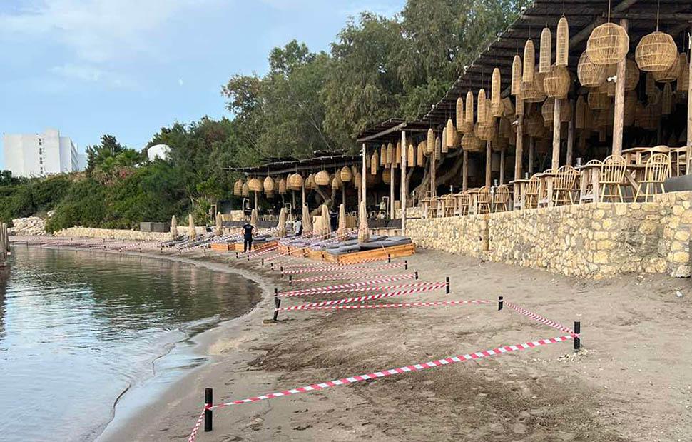 Κατά τον έλεγχο διαπιστώθηκε η εγκατάσταση παράνομων κατασκευών (19 μεταλλικές κατασκευές) εντός της θάλασσας καθώς και παραβάσεις στον αιγιαλό. Ανάλογη παράβαση είχε διαπιστωθεί και πέρυσι, στην ίδια παραλία και από την ίδια επιχείρηση, και αμέσως οι αρμόδιες υπηρεσίες προχώρησαν στην έκδοση των πρωτοκόλλων κατεδάφισης τους.