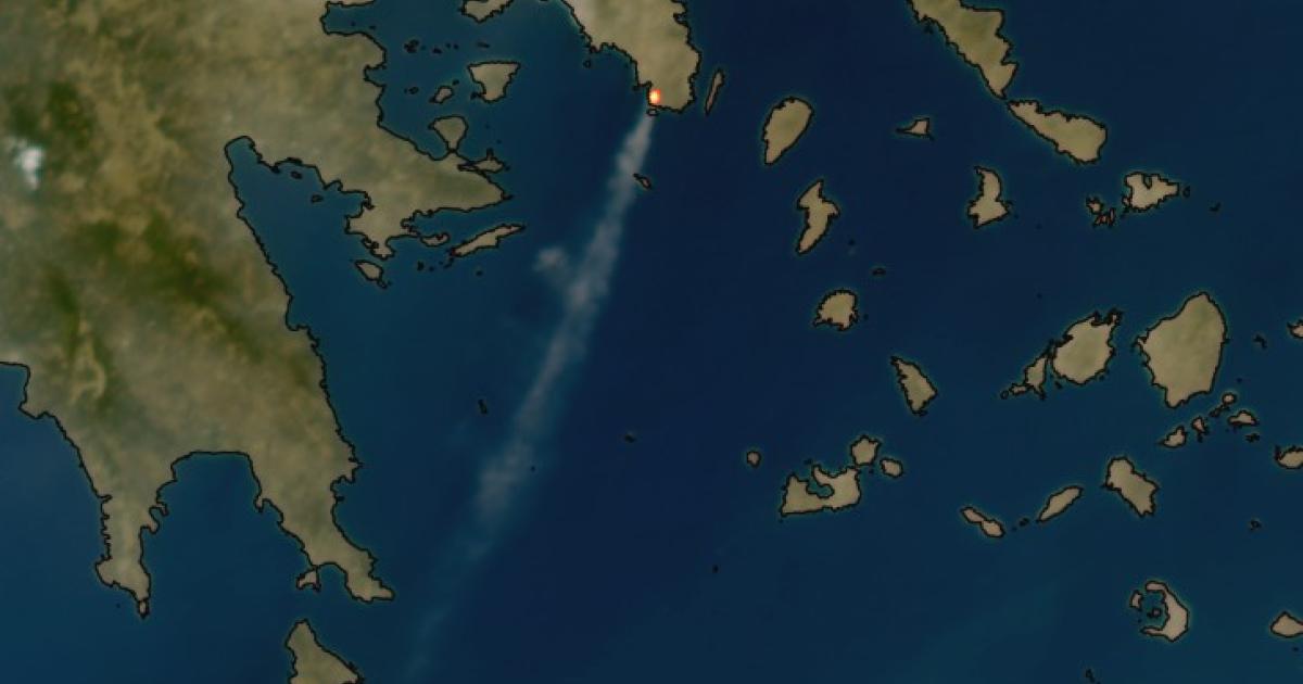 Η πυρκαγιά είναι «ορατή» και από τον γεωστατικό δορυφόρο Meteosat-12, με τον καπνό να έχει μεταφερθεί σε απόσταση περίπου 180 km νοτιοδυτικά και να εντοπίζεται πάνω από τη θαλάσσια περιοχή των Κυθήρων, όπως χαρακτηριστικά αποτυπώνεται στην επόμενη εικόνα.