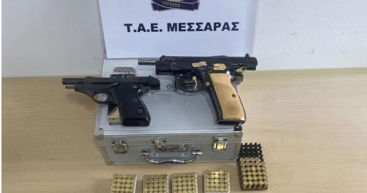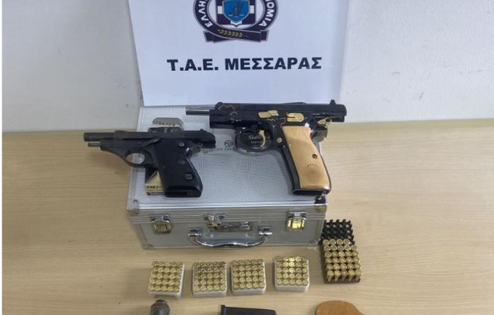 Εκεί βρήκαν και κατάσχεσαν δύο πιστόλια, δύο γεμιστήρες, 129 σφαίρες, μία δερμάτινη θήκη πιστολιού, μεταλλική ράβδο και μεταλλικό κυτίο όπλου.