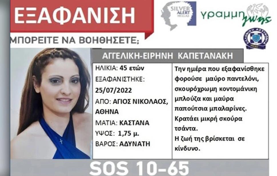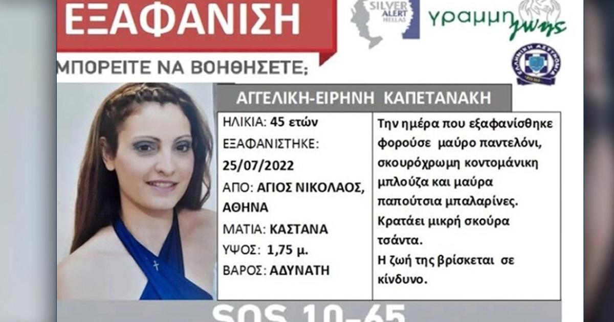 Συνεχίζονται οι έρευνες για πέμπτη ημέρα από τους ανθρώπους της υπηρεσίας Silver Alert για τον εντοπισμό της 45χρονης μητέρας δύο παιδιών, Αγγελικής -Ειρήνης Καπετανάκη που έφυγε το πρωί της περασμένης Δευτέρας από το σπίτι της στην περιοχή του Αγίου Νικολάου Αττικής, για να πάει στη δουλειά της και έκτοτε δεν έχει δώσει σημάδια ζωής.