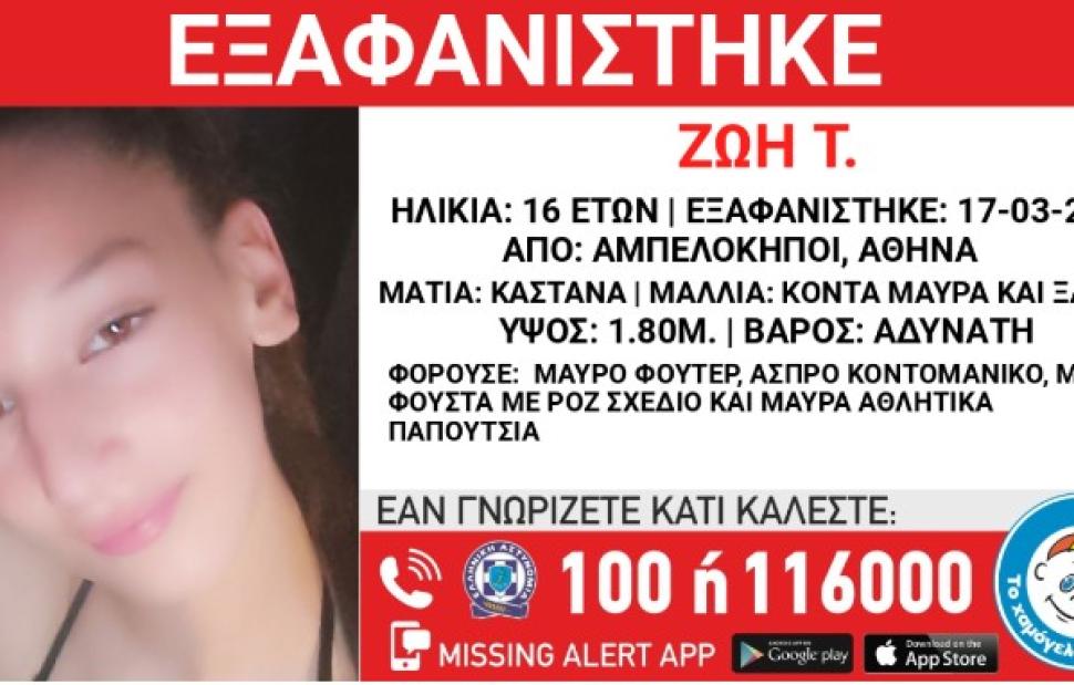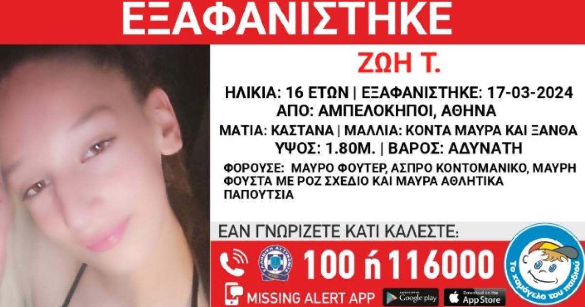 Στις 17.03.2024, πρωινές ώρες, εξαφανίστηκε από την περιοχή των Αμπελοκήπων στην Αθήνα, η Ζωή Τ., 16 ετών. Το «Χαμόγελο του Παιδιού» ενημερώθηκε για την εξαφάνιση της ανήλικης και προχώρησε στη δημοσιοποίηση των στοιχείων της, κατόπιν αιτήματος της οικογένειας της, καθώς συντρέχουν σοβαροί λόγοι που θέτουν τη ζωή της σε κίνδυνο.