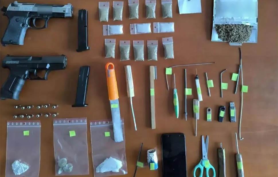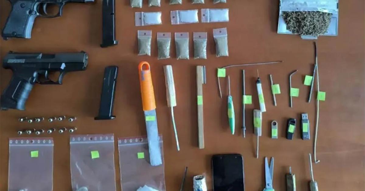 Κατά τη διάρκεια του σωματικού ελέγχου και των ερευνών που έγιναν στα σπίτια τους βρέθηκαν, 29,23 γραμ. κάνναβης, 8,17 γραμ. μεθαμφεταμίνης, 22,65 γραμ. φυτικών αποσπασμάτων ναρκωτικής ουσίας, 3 κινητά τηλέφωνα, 30 ευρώ, 3 συσκευασίες καρτών κινητής τηλεφωνίας, 0,09 γραμμ. ηρωνίνης, 3 πιστόλια και 12 αβολίδωτα φυσίγγια.