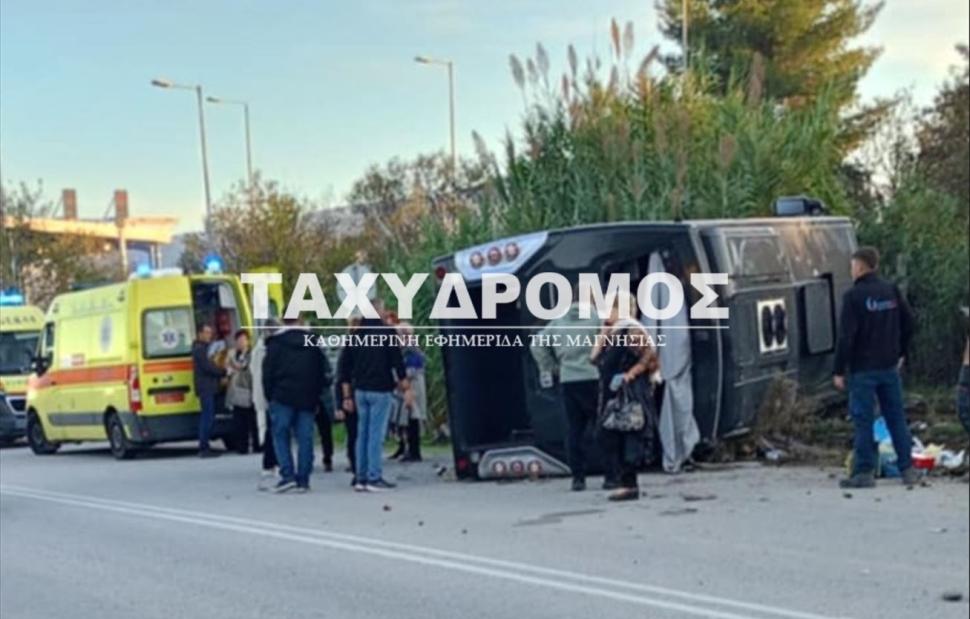 Ένα λεωφορείο με περίπου 40 επιβάτες εξετράπη από την πορεία του και ανατράπηκε το απόγευμα του Σαββάτου στην παλιά Εθνική Οδό πριν τον Ριζόμυλο του Βόλου, ένα χιλιόμετρο πριν το κέντρο διασκέδασης «Μέγαρο».