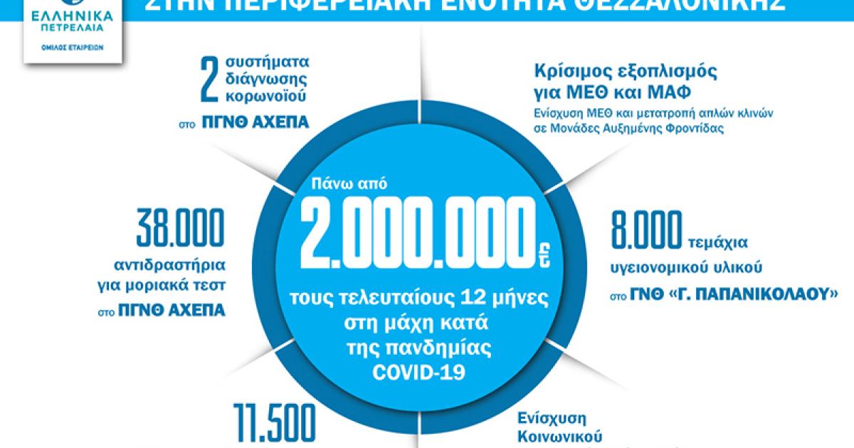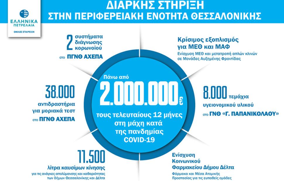 Στο πλαίσιο των δράσεων Εταιρικής Κοινωνικής Ευθύνης που σχεδιάζει και υλοποιεί κάθε χρόνο, ο Όμιλος ΕΛΛΗΝΙΚΑ ΠΕΤΡΕΛΑΙΑ συντάσσεται με ενεργό και υπεύθυνο τρόπο στο πλευρό των τοπικών κοινωνιών, στις οποίες δραστηριοποιείται. Από το ξεκίνημα της πανδημίας -μόνο στη Θεσσαλονίκη- έχει πραγματοποιήσει δωρεές ιατροτεχνολογικού εξοπλισμού και αναλωσίμων, το ύψος των οποίων ξεπερνά τα 2.000.000 ευρώ, στηρίζοντας ενεργά το πολύτιμο έργο που επιτελούν τα νοσοκομεία και οι φορείς της Περιφερειακής Ενότητας για την προστασία των πολιτών.