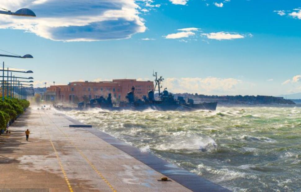 Τα κύματα δεκάδων μέτρων χτυπούν την παραλιακή ενώ στο έλεός τους βρίσκεται το ιστορικό αντιτορπιλικό “Βέλος”, το οποίο είναι αγκυροβολημένο στη Νέα Παραλία. Το πλήρωμα καταβάλλει τεράστιες προσπάθειες να το διατηρήσει στη θέση του.