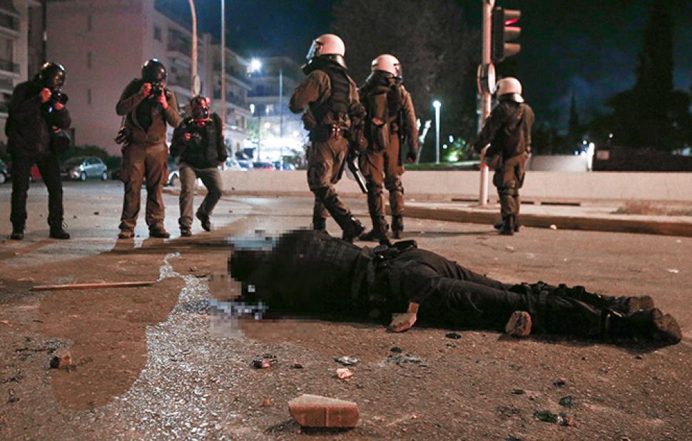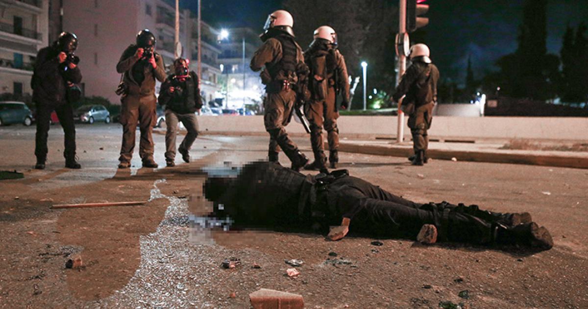 Κουκουλοφόροι έριξαν τον αστυνομικό από τη μηχανή του και άρχισαν να τον χτυπούν ανελέητα. Ο άνθρωπος βρέθηκε αιμόφυρτος στο έδαφος, μέχρι που οι συνάδελφοί του έκαναν κλοιό γύρω του.