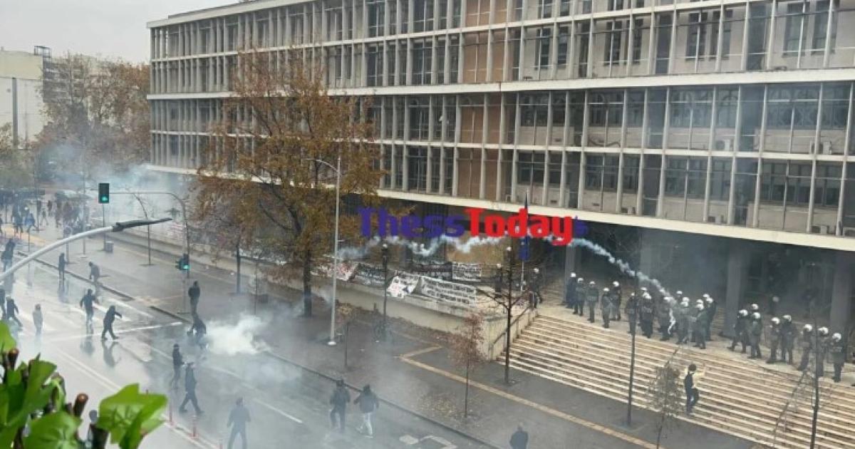 Τα άτομα του αντιεξουσιαστικου χώρου επιτέθηκαν πετώντας αντικείμενα κατά των αστυνομικών δυνάμεων με τα ΜΑΤ να απαντούν με χειροβομβίδες κρότου λάμψης και δακρυγόνα.