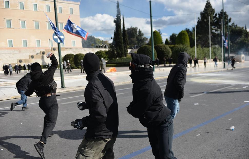 Ακολούθως, την 15:50 ώρα και ενώ η κεφαλή της πορείας εισερχόταν από την Όθωνος στη Λεωφόρο Βασιλίσσης Αμαλίας, ομάδα 50 περίπου ατόμων, έχοντας καλυμμένα τα χαρακτηριστικά των προσώπων τους, αποσπάστηκαν από τον κορμό της πορείας και επιτέθηκαν με ρίψη μολότοφ και πετρών στις αστυνομικές δυνάμεις που βρίσκονταν στο Μνημείο του Άγνωστου Στρατιώτη.