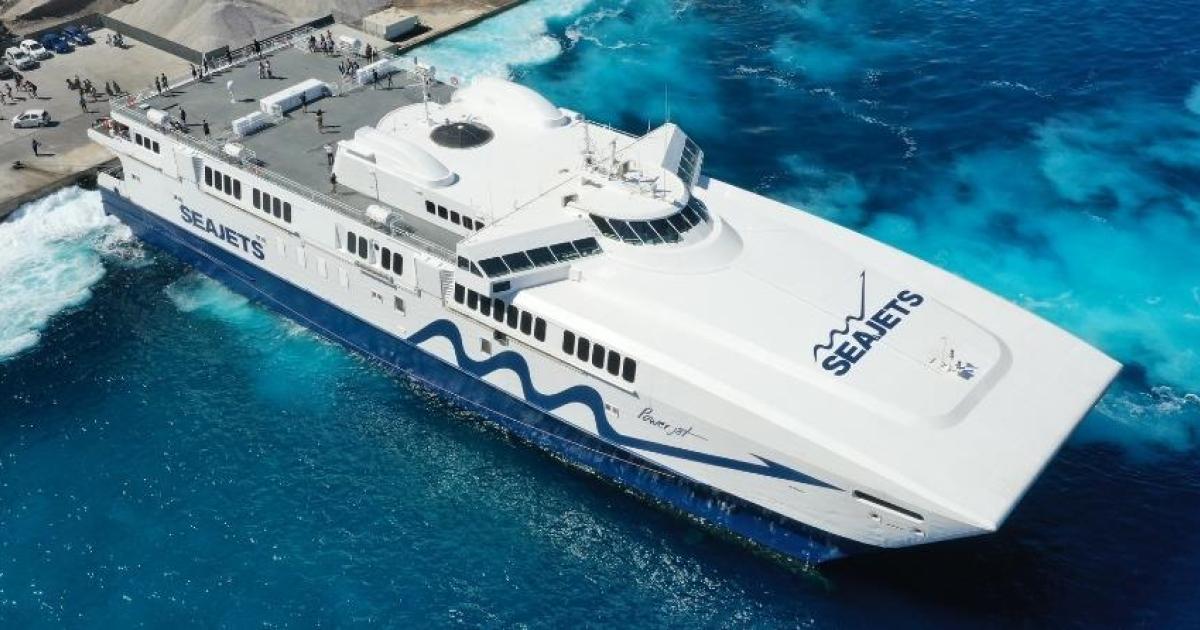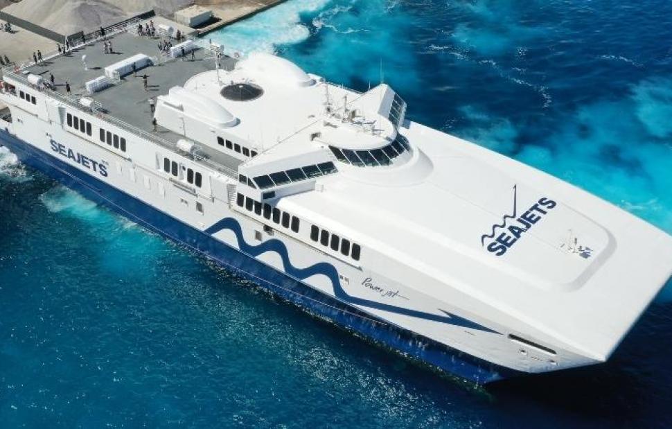 Ελεγχόμενη εισροή υδάτων στον αριστερό άξονα, παρουσίασε το επιβατηγό οχηματαγωγό καταμαράν “Power Jet”, λίγο μετά τον απόπλου του από το λιμάνι του Αθηνιού στη Σαντορίνη για το Ηράκλειο της Κρήτης, με 333 επιβάτες 17 ΙΧ και δύο δίκυκλα.