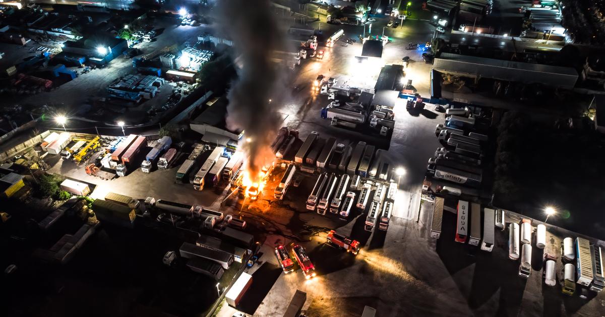 Τέσσερα άτομα με καλάσνικοφ εμφανίστηκαν στο βενζινάδικο, απείλησαν τον φύλακα και στη συνέχεια έκαψαν δύο νταλίκες, οι οποίες καταστράφηκαν ολοσχερώς.