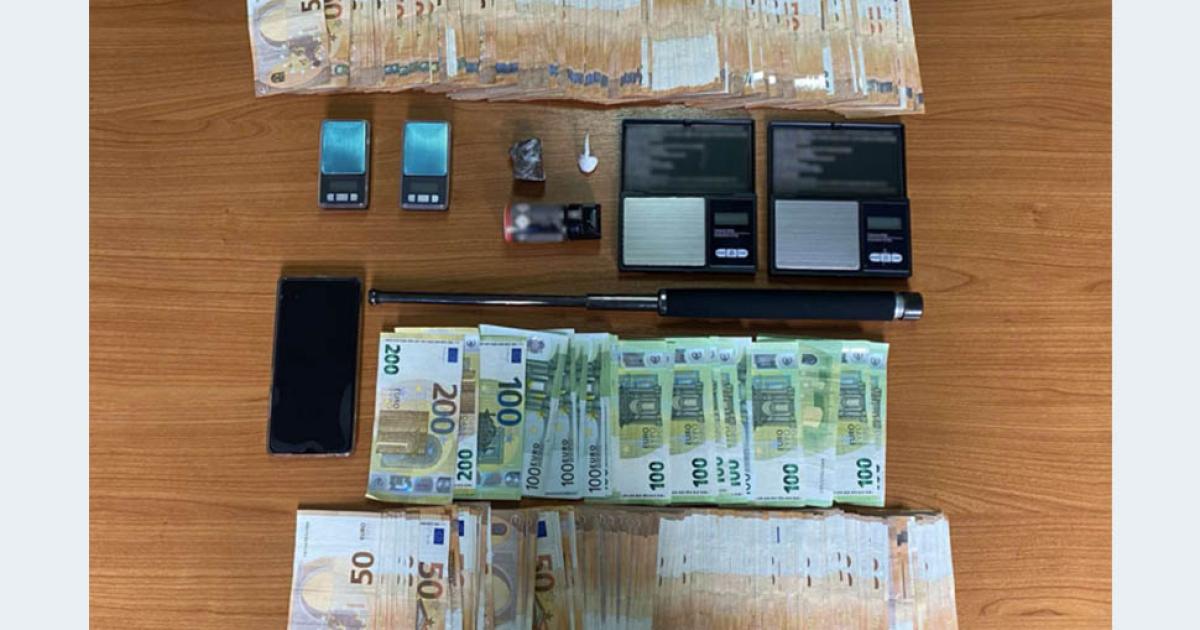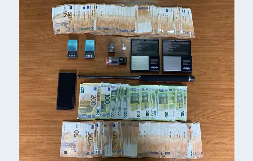 Στην συνέχεια, ακολούθησαν έρευνες σε μια αποθήκη που χρησιμοποιούσε, όπου βρέθηκαν ένα σπρέι πιπεριού, ένα πτυσσόμενο μεταλλικό κλομπ και τρεις ηλεκτρονικές ζυγαριές και στην κατοικία του σε περιοχή της Θεσσαλονίκης, όπου κατασχέθηκαν τα «μαύρα» έσοδά του ύψους 21.350 ευρώ και άλλη μία ηλεκτρονική ζυγαριά.