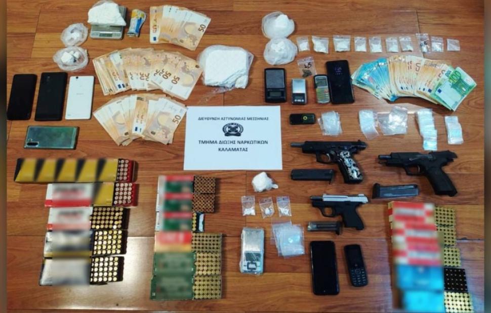 Στο σπίτι του αλλοδαπού βρέθηκαν 663 γραμμάρια κοκαΐνης, μία ζυγαριά ακριβείας, τέσσερα κινητά και 5.855 ευρώ, ενώ στο σπίτι του πιλότου βρέθηκαν 29 γραμμάρια κοκαΐνης, μία ζυγαριά ακριβείας, δύο κινητά, 784 φυσίγγια διαφόρων τύπων και διαμετρημάτων και τρία πιστόλια που εστάλησαν στα εργαστήρια της Εγκληματολογικής υπηρεσίας για βαλλιστική εξέταση, από τα οποία το ένα είχε κλαπεί από αστυνομικό το 2014 στην Κρήτη!