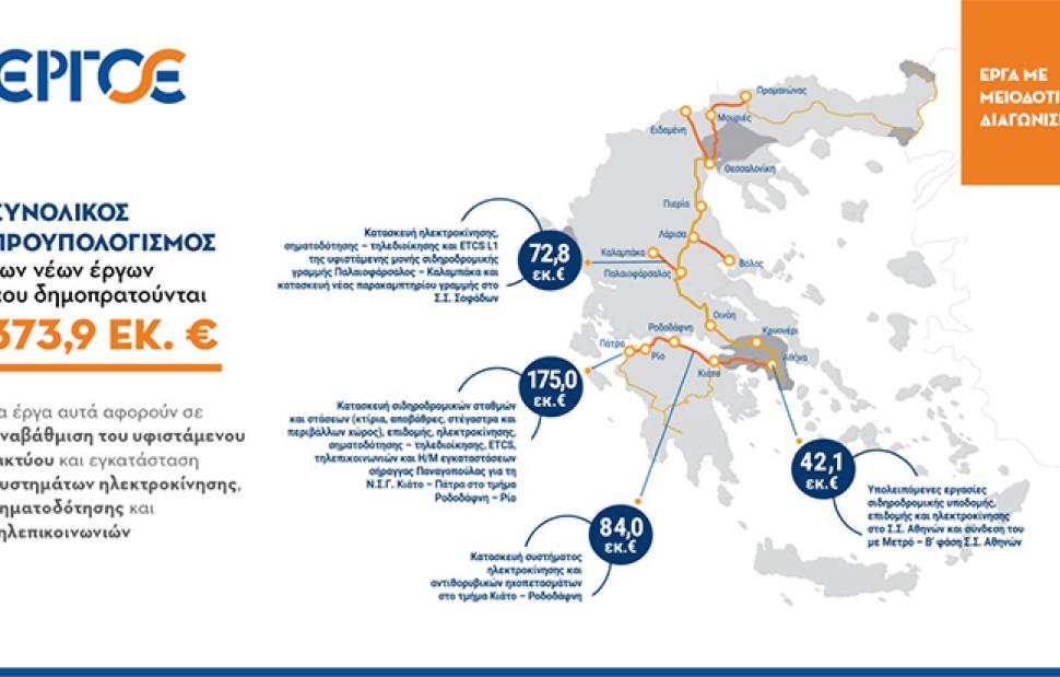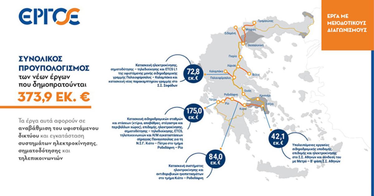 Με αμείωτους ρυθμούς συνεχίζει η ΕΡΓΟΣΕ τις διαδικασίες για την ολοκλήρωση κομβικών υποδομών που αναβαθμίζουν το σιδηροδρομικό δίκτυο της χώρας, προχωρώντας στη δημοπράτηση τεσσάρων έργων, συνολικού προϋπολογισμού €373,9 εκατ.