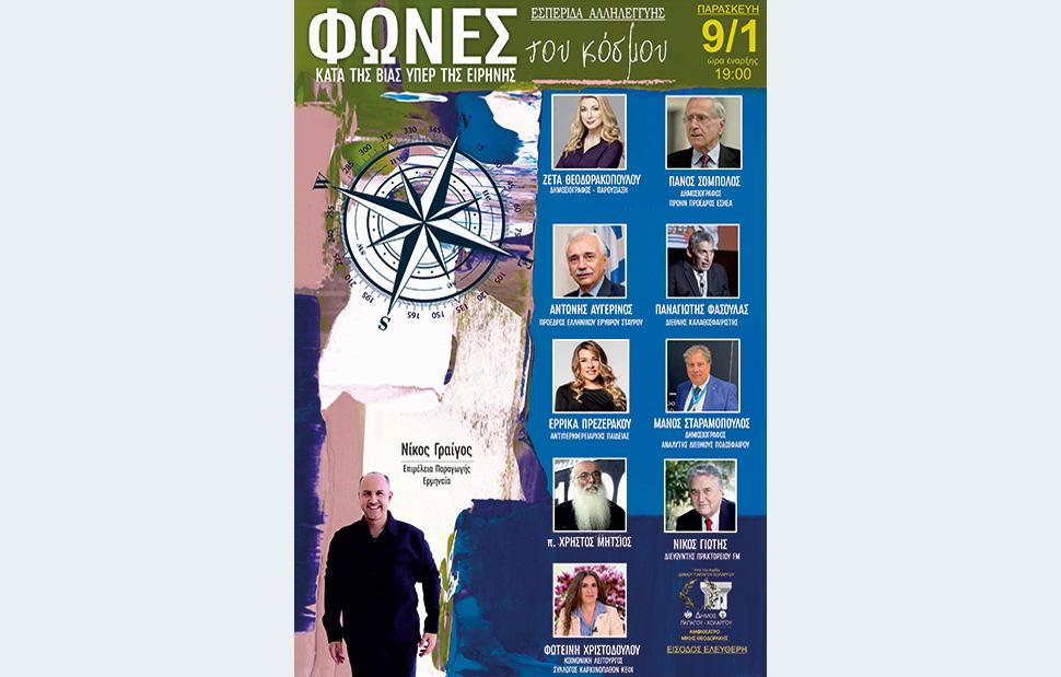 Άνθρωποι από διαφορετικούς χώρους ενώνουν τις φωνές τους σε μια εσπερίδα κατά της βίας, υπέρ της Παγκόσμιας Ειρήνης, με τίτλο «Φωνές του κόσμου», στέλνοντας το μήνυμα ότι η ελπίδα και η ανθρωπιά είναι το φως που μπορεί μέσα από τις αρχές και τα ιδεώδη του Ελληνικού πολιτισμού να νικήσουν την σκληρότητα των καιρών μας. Κανένα παιδί δεν πρέπει να μεγαλώνει μέσα στον φόβο. Κανένας άνθρωπος δεν πρέπει να αισθάνεται μόνος απέναντι στη βία.