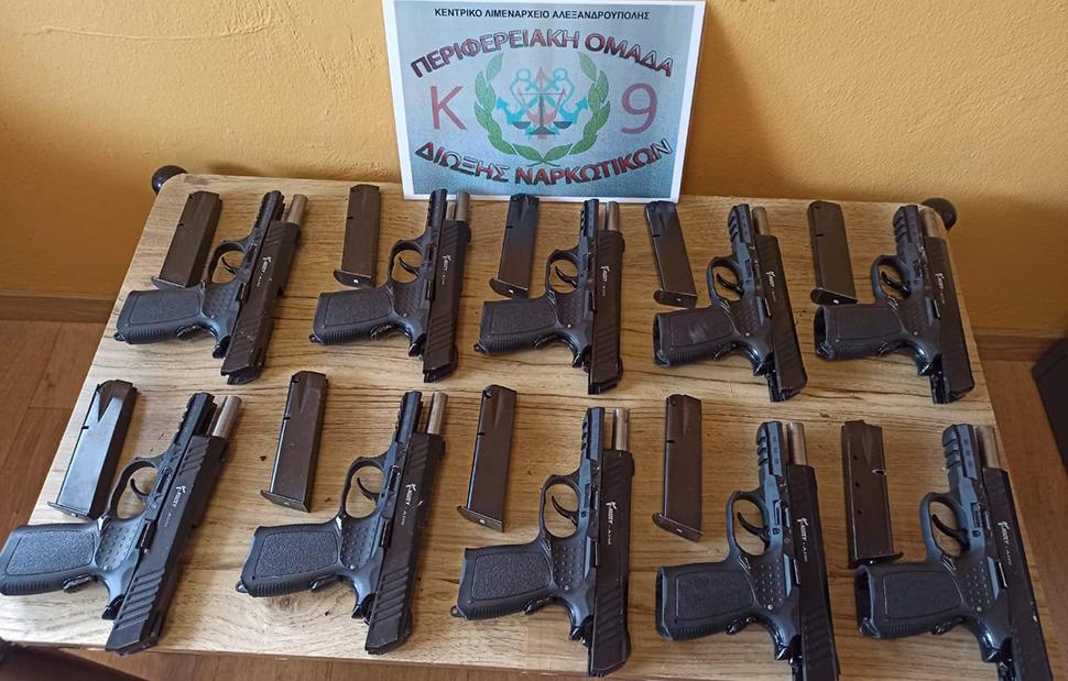 Συναγερμός σήμανε στις 11:00 το πρωί της Παρασκευής στον Έβρο, όταν στελέχη της Περιφερειακής Ομάδας Δίωξης Ναρκωτικών του Κεντρικού Λιμεναρχείου Αλεξανδρούπολης, σε συνεργασία με στελέχη της Υπηρεσίας Δίωξης Ναρκωτικών της Διεύθυνσης Αστυνομίας Κομοτηνής, συνέλαβαν πέντε παράτυπους μετανάστες στην κατοχή των οποίων βρέθηκαν 10 πιστόλια τουρκικής κατασκευής των 9mm.