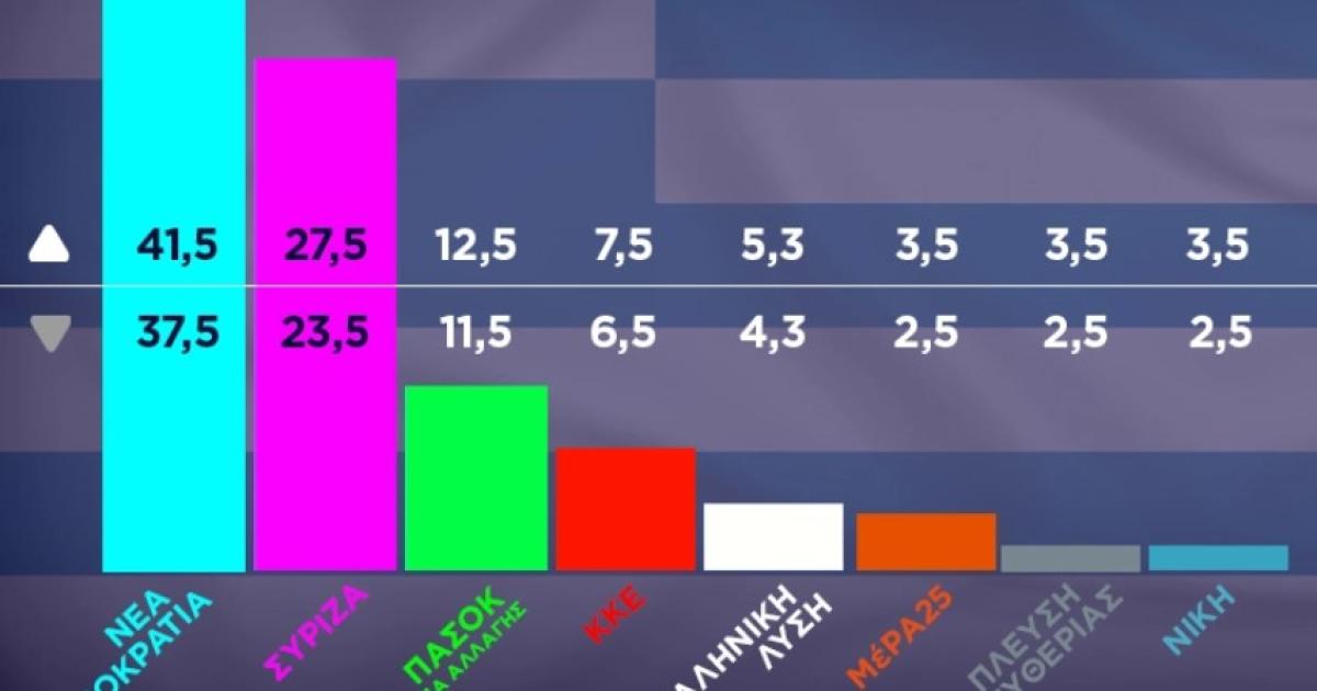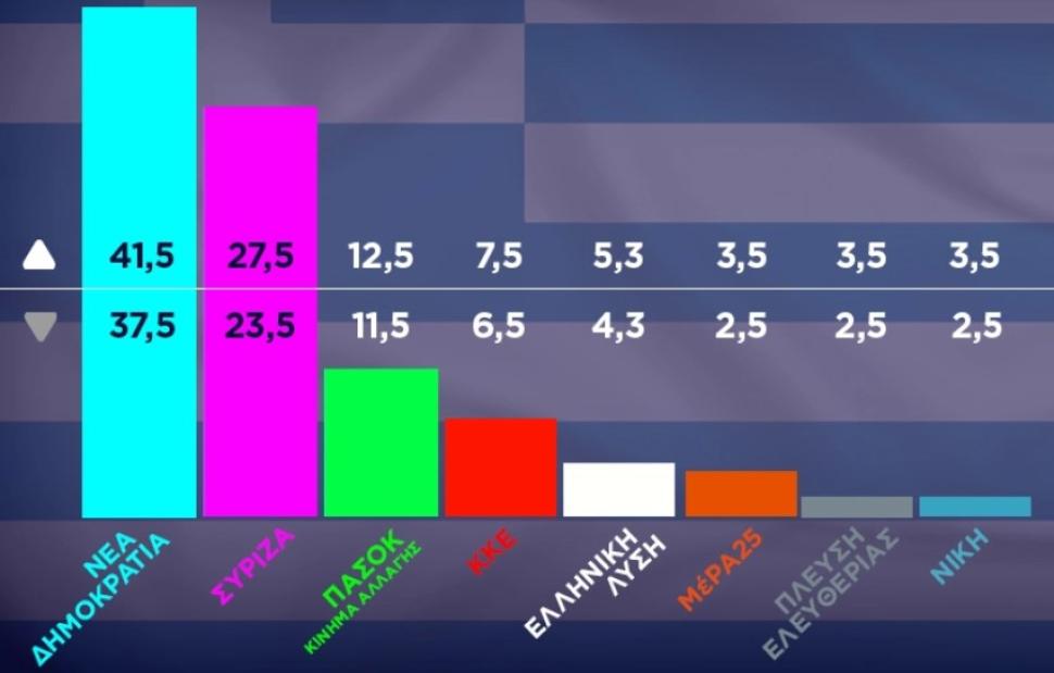 Σύμφωνα με το κοινό exit poll, η Νέα Δημοκρατία αναμένεται να λάβει από 41,5 έως 37,5 Ο ΣΥΡΙΖΑ κινείται σε πολύ χαμηλότερα επίπεδα από 27,5-23,5 .