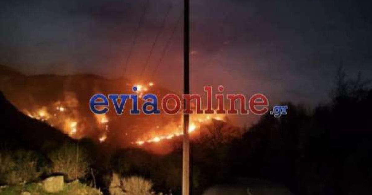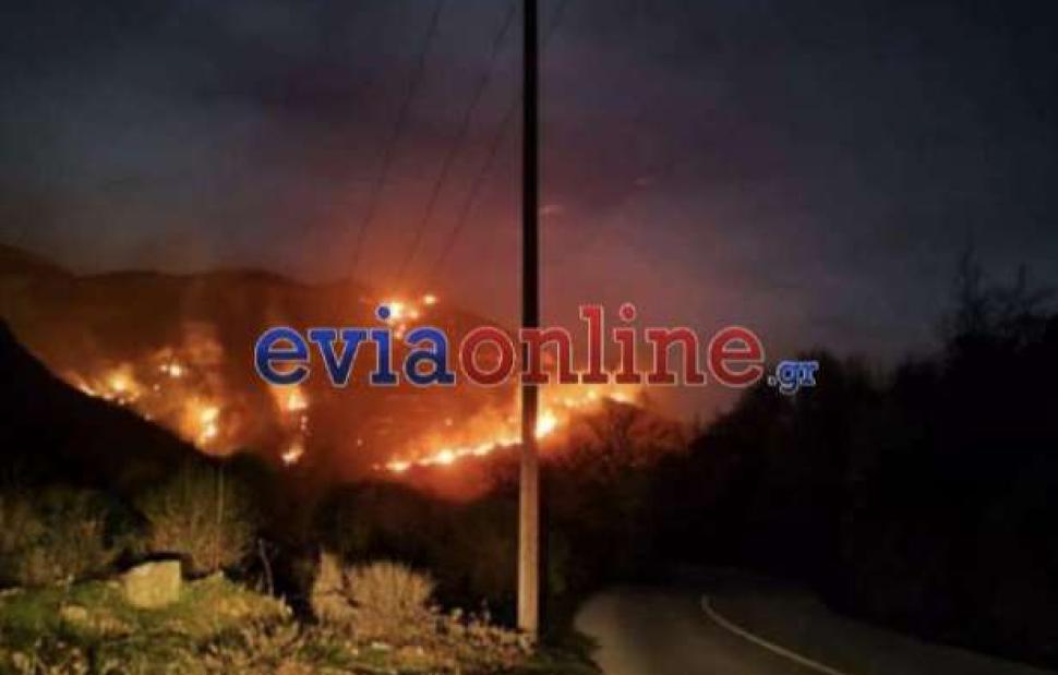 Η φωτιά καίει χαμηλή βλάστηση με πουρνάρια. Το σημείο όπου μαίνεται η πυρκαγιά είναι δύσβατο, σύμφωνα με το evia online.