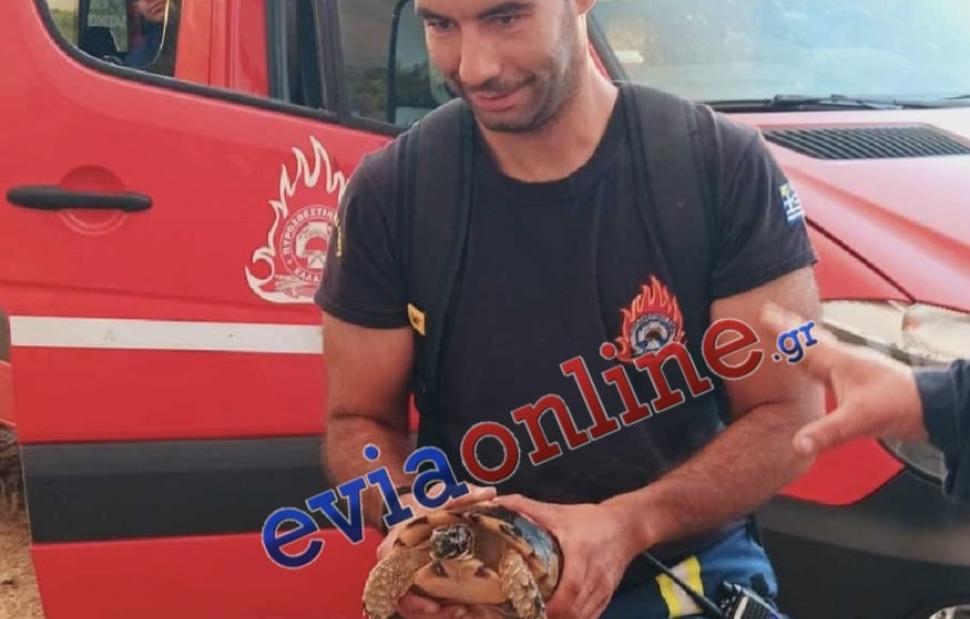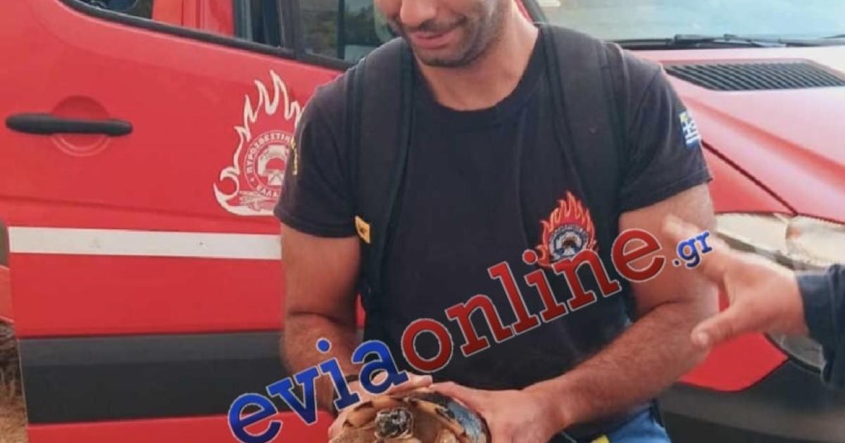 Την ώρα που η πυρκαγιά κοντά στο Αφράτι στην Εύβοια ήταν σε εξέλιξη, ένας πυροσβέστης εντόπισε μία χελώνα που κινδύνευε, την απομάκρυνε από το σημείο και αφού πρώτα μαζί με τους συναδέλφους του, της έδωσαν νερό και την κατάβρεξαν, την άφησαν σε ασφαλές σημείο.