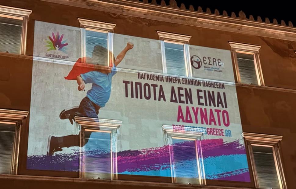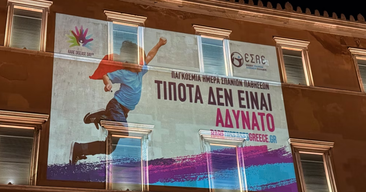 Το ελληνικό κοινοβούλιο συμμετείχε φέτος στην ανάδειξη της Παγκόσμιας Ημέρας Σπάνιων Παθήσεων με τη φωταγώγηση της πρόσοψής του, στέλνοντας μήνυμα ευαισθητοποίησης και συμπαράστασης προς τους ανθρώπους που ζουν με σπάνια νοσήματα.
