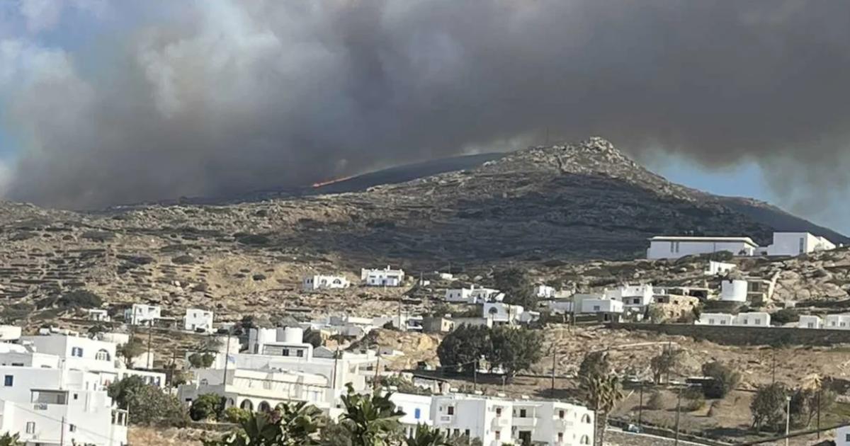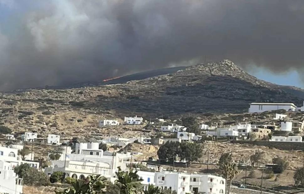 Η φωτιά ξεκίνησε στην περιοχή Περιβόλια και επεκτείνεται προς τον Πύργο, δύο οικισμούς στο βόρειο τμήμα του νησιού, αναφέρει το cyclades24.