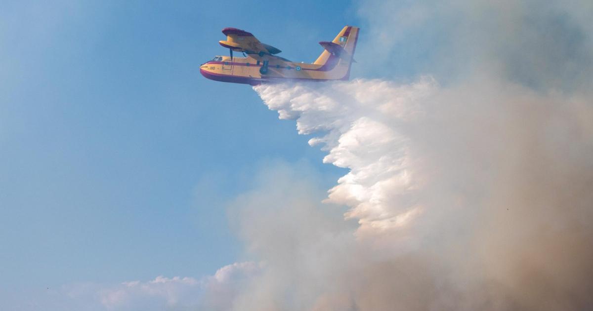 Από αέρος πραγματοποιούν ρίψεις ένα ελικόπτερο και ένα αεροσκάφος.
