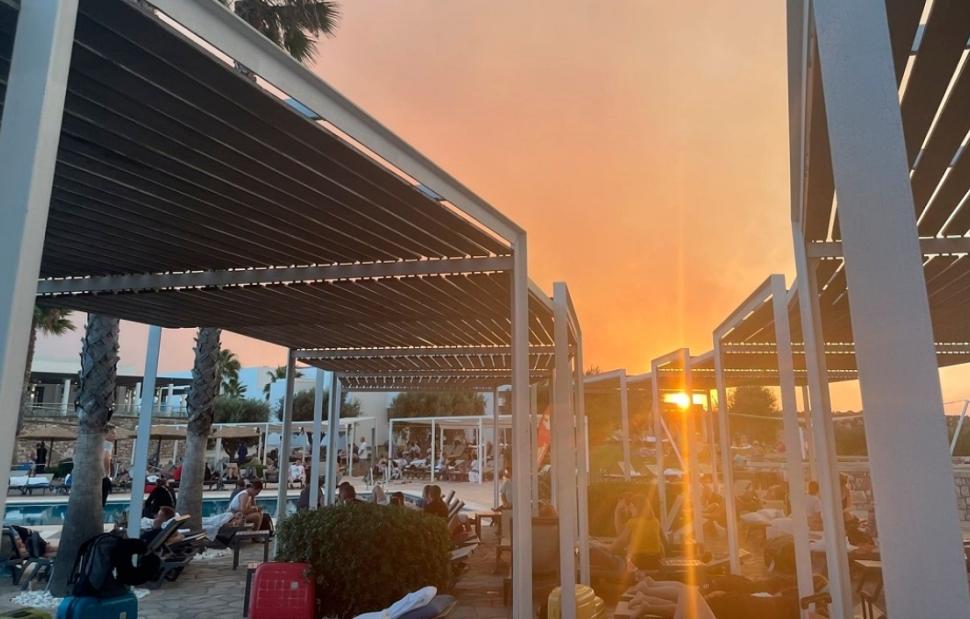 Still on #rhodes on the south side at a hotel after getting on a bus. Slept on sun beds outside with hundreds of other people, woke up to see the fire on the horizon and ash falling on us. Hotel is looking after us but no idea how we are leaving the island yet. pic.twitter.com/mdPgJyaGnq