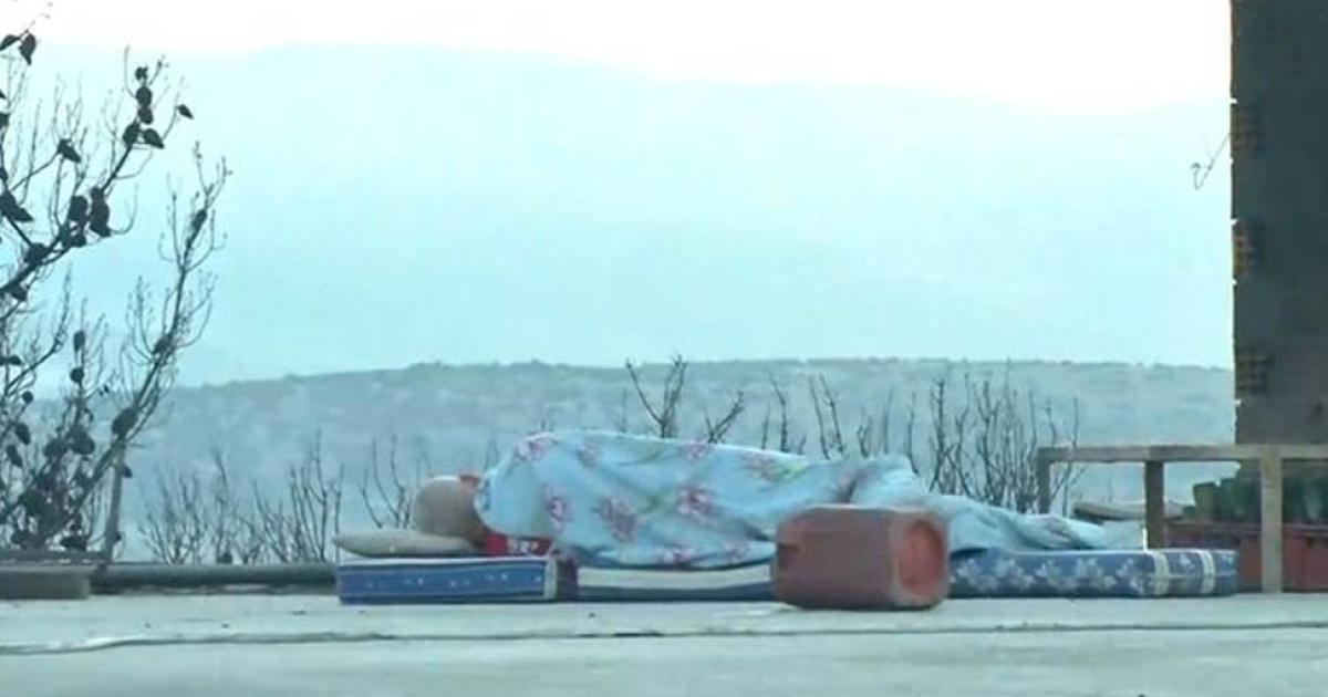 Σε ένα αυτοσχέδιο στρώμα, καλυμμένος με ένα σεντόνι κοιμάται ένας άνθρωπος πάνω στο καμένο του σπίτι στο Τσακάλι Μάνδρας, έπειτα από την καταστροφική πυρκαγιά που κατέκαψε την περιοχή το μεσημέρι της Τρίτης (18/8).