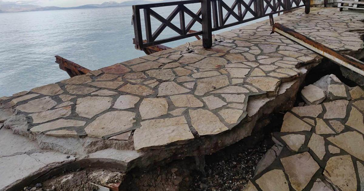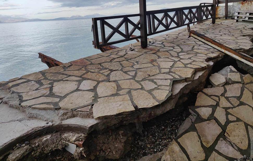 Η θάλασσα στο Καμάρι Ξυλοκάστρου σε πολλά σημεία «έχει βγει» στην ξηρά με αποτέλεσμα να έχει προκαλέσει ζημιές σε σπίτια και καταστήματα που κινδυνεύουν άμεσα.