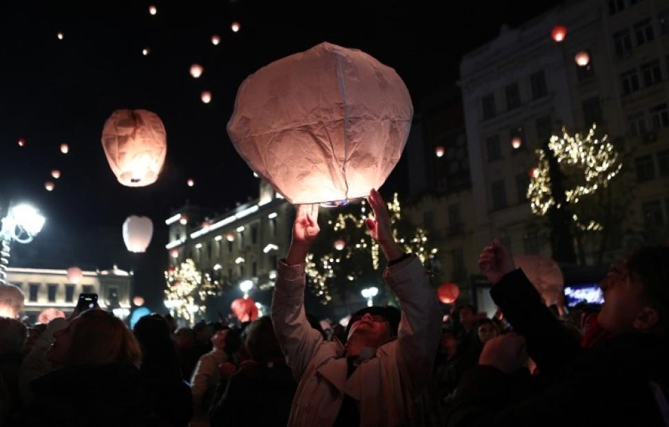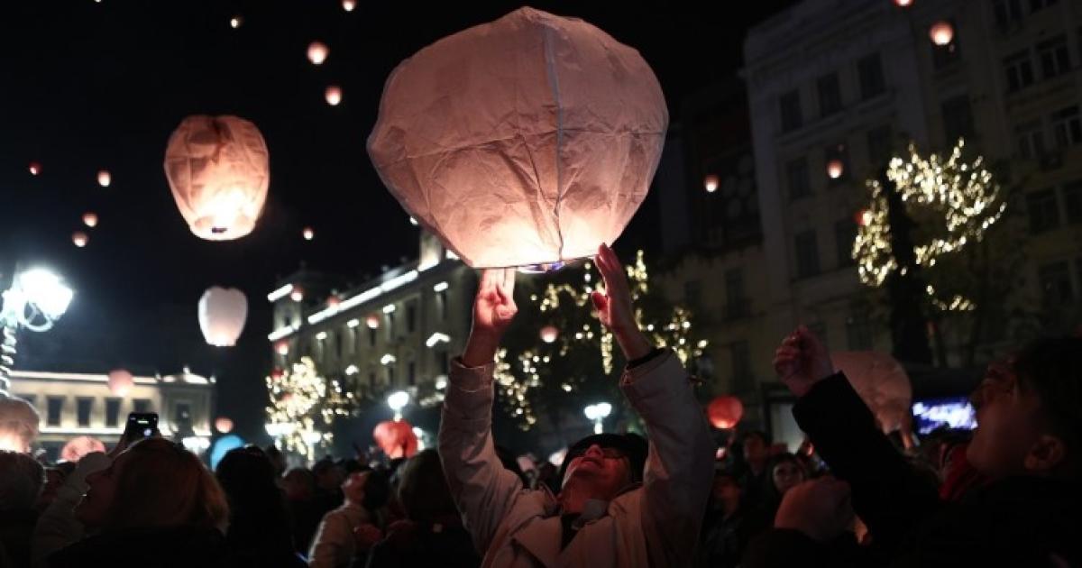Μπροστά από το Δημαρχείο της Αθήνας, σε χριστουγεννιάτικο σκηνικό, μικροί και μεγάλοι άναψαν περισσότερα βιοδιασπώμενα φαναράκια και τα άφησαν να ανέβουν ψηλά στον ουρανό, μαζί με τις ευχές τους.