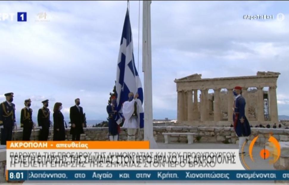 Λίγο μετά τις 8 το πρωί πραγματοποιήθηκε η τελετή έπαρσης της ελληνικής σημαίας στον Ιερό Βράχο της Ακροπόλεως παρουσία της Προέδρου της Δημοκρατίας, Κατερίνας Σακελλαροπούλου και του Πρωθυπουργού, Κυριάκου Μητσοτάκη.