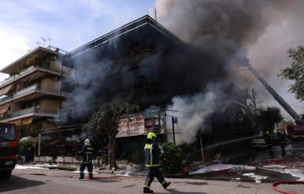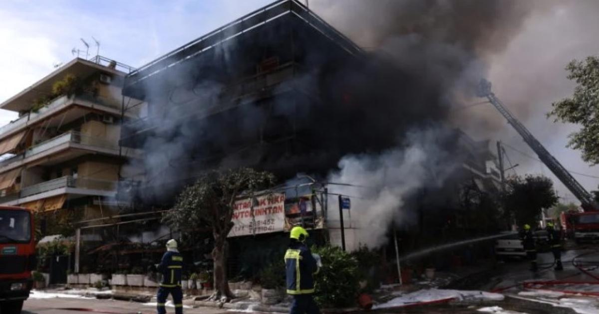Οι φλόγες από τη μεγάλη φωτιά έχουν επεκταθεί και σε διαμερίσματα τα οποία βρίσκονται πάνω από το κατάστημα ανταλλακτικών ενώ από το σημείο ακούγονται δυνατές εκρήξεις.