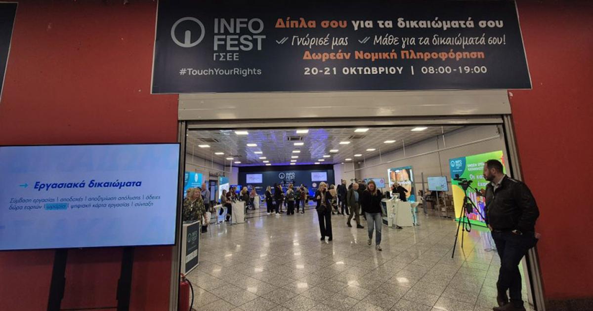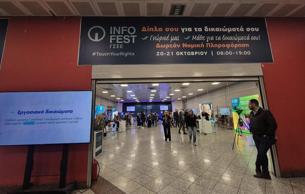 Με κεντρικό σύνθημα #touchyourrights άνοιξε σήμερα τις πύλες του το INFOFEST ΓΣΕΕ, το ενημερωτικό φεστιβάλ της Συνομοσπονδίας στην καρδιά της Αθήνας, στην Αίθουσα Πολλαπλών Χρήσεων του Μετρό Συντάγματος. Εκατοντάδες πολίτες επισκέφτηκαν το χώρο του φεστιβάλ, έλαβαν έντυπο ενημερωτικό υλικό, «έπαιξαν» με τα ψηφιακά apps και ενημερώθηκαν για εργασιακά, ασφαλιστικά και καταναλωτικά θέματα.