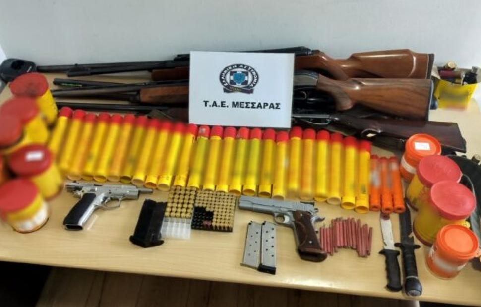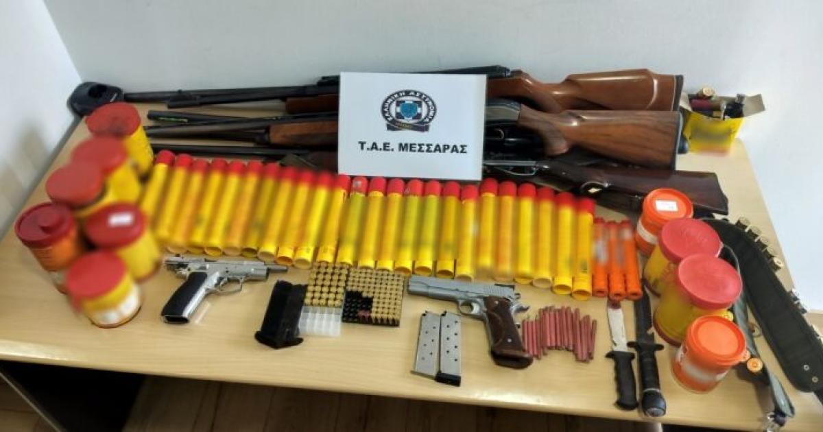 Ένα “οπλοστάσιο” φέρονται να είχαν στην κατοχή τους δύο άνδρες, 39 και 74 ετών, οι οποίοι συνελήφθησαν σήμερα, Σάββατο, το πρωί, σε περιοχή του Δήμου Φαιστού. Οι αστυνομικοί που έκαναν έρευνα στα σπίτια και σε αποθήκες τους βρήκαν και κατάσχεσαν, μεταξύ άλλων 8 όπλα, γεμιστήρες, φυσίγγια, ναυτικές φωτοβολίδες και καπνογόνα.
