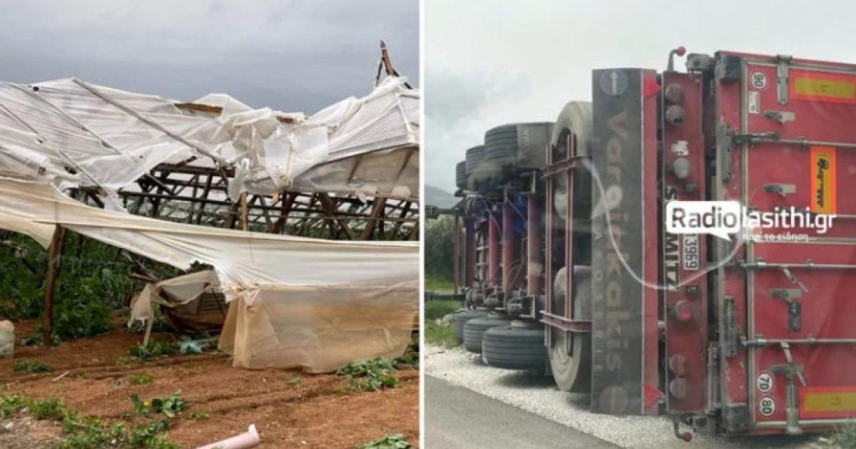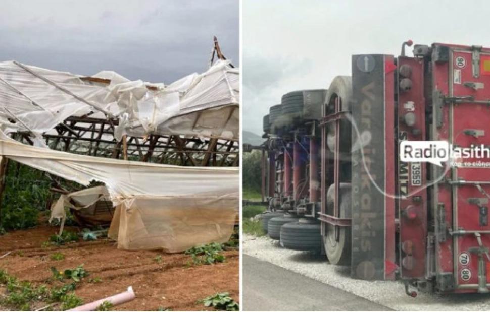 Σύμφωνα με το radiolasithi.gr, στην περιοχή του Αναδασμού, οι ισχυρές ριπές ανέμου ανέτρεψαν μια σταθμευμένη νταλίκα, γεγονός που αναδεικνύει τον υψηλό βαθμό επικινδυνότητας για οδηγούς και εργαζόμενους. Σε μικρή απόσταση, ένα ξύλινο θερμοκήπιο, το οποίο βρισκόταν σε πλήρη παραγωγική λειτουργία, καταστράφηκε σχεδόν ολοκληρωτικά, προκαλώντας απόγνωση στους ιδιοκτήτες.