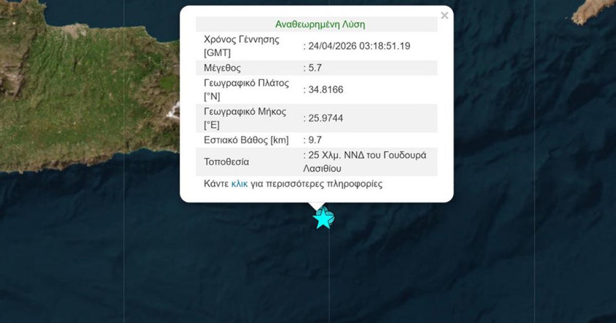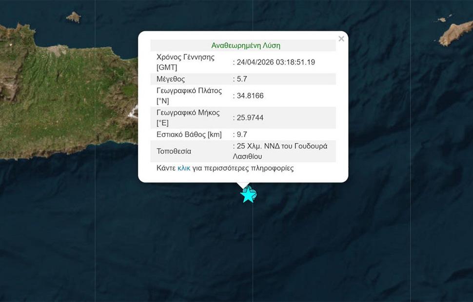 Ισχυρός σεισμός μεγέθους 5,7 βαθμών της κλίμακας Ρίχτερ, σημειώθηκε το πρωί της Παρασκευής (24/4) και ειδικότερα στις 6:18 ανοιχτά του Λασιθίου Κρήτης, σύμφωνα με το Γεωδυναμικό Ινστιτούτο του Αστεροσκοπείου Αθηνών,