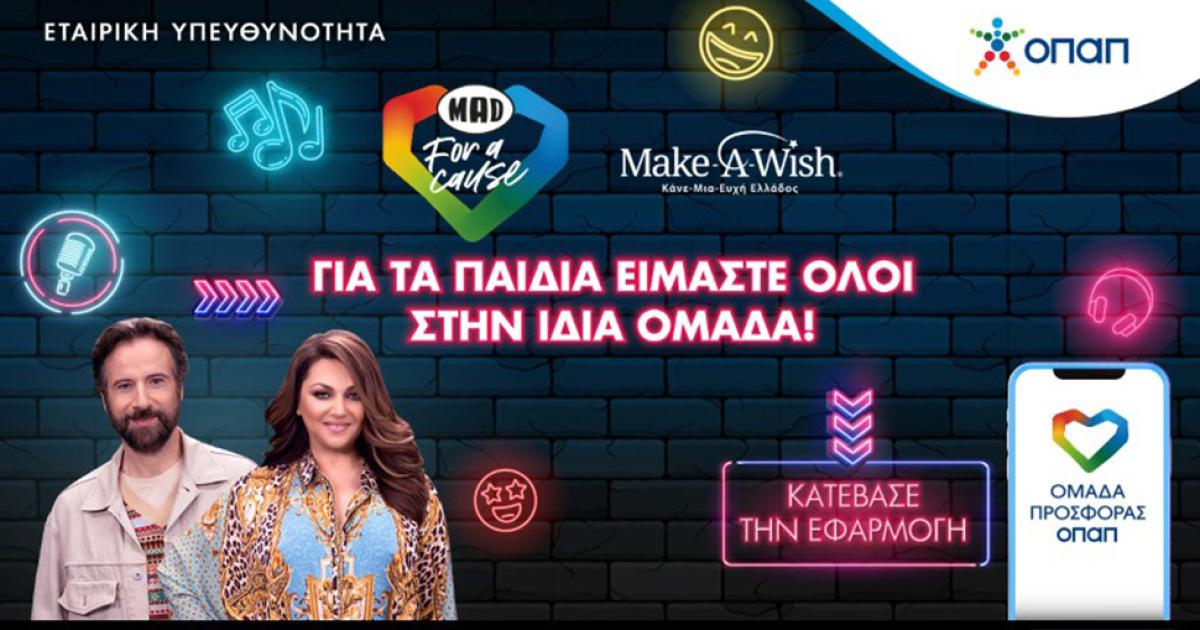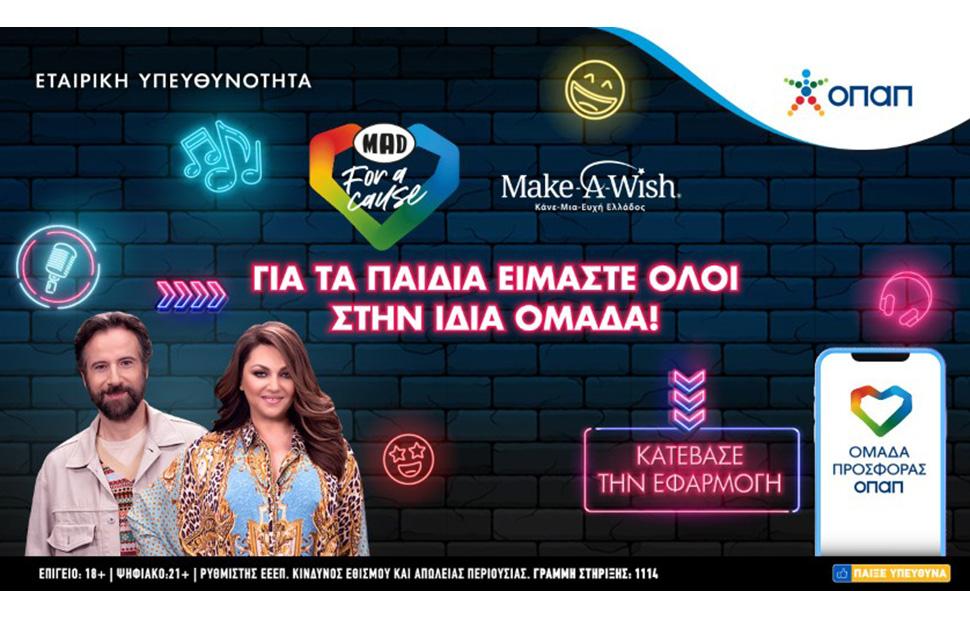 Τέσσερα παιδιά του Make-A-Wish (Κάνε-Μια-Ευχή Ελλάδος), που πάσχουν από σοβαρά νοσήματα, θα δουν τις ευχές τους να γίνονται πραγματικότητα μέσα από την πρωτοβουλία “MAD For a Cause”, που υλοποιεί ο ΟΠΑΠ με την υποστήριξη του MAD. Στην εκπλήρωση των παιδικών ευχών μπορούμε να συμβάλουμε όλοι δωρεάν, μπαίνοντας στην «Ομάδα Προσφορά ΟΠΑΠ». Παράλληλα, διεκδικούμε δύο δώρα εμπειρίας από την Καίτη Γαρμπή και τον Κωστή Μαραβέγια, οι οποίοι υποστηρίζουν τη σημαντική πρωτοβουλία του ΟΠΑΠ για παιδιά.