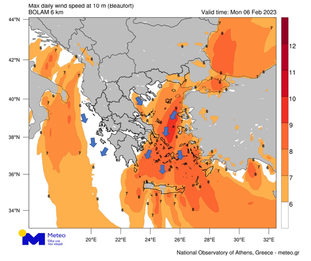 Παράλληλα, σύμφωνα με τα προγνωστικά στοιχεία του Εθνικού Αστεροσκοπείου Αθηνών / Meteo.gr, θυελλώδεις και τοπικά πολύ θυελλώδεις βόρειοι άνεμοι θα πνέουν στο Αιγαίο κατά τη διάρκεια της Δευτέρας 06/02 (Χάρτης 2), με σταδιακή εξασθένηση από τις μεσημεριανές ώρες.