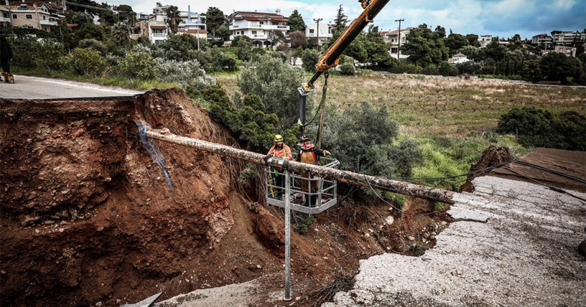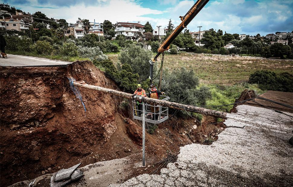 Ο δρόμος -που συνδέει την Καλλιτεχνούπολη με την Λεωφόρο Μαραθώνος και το Νταού Πεντέλης- κατέρρευσε τελείως, κόβοντας την οδική αρτηρία στη μέση.