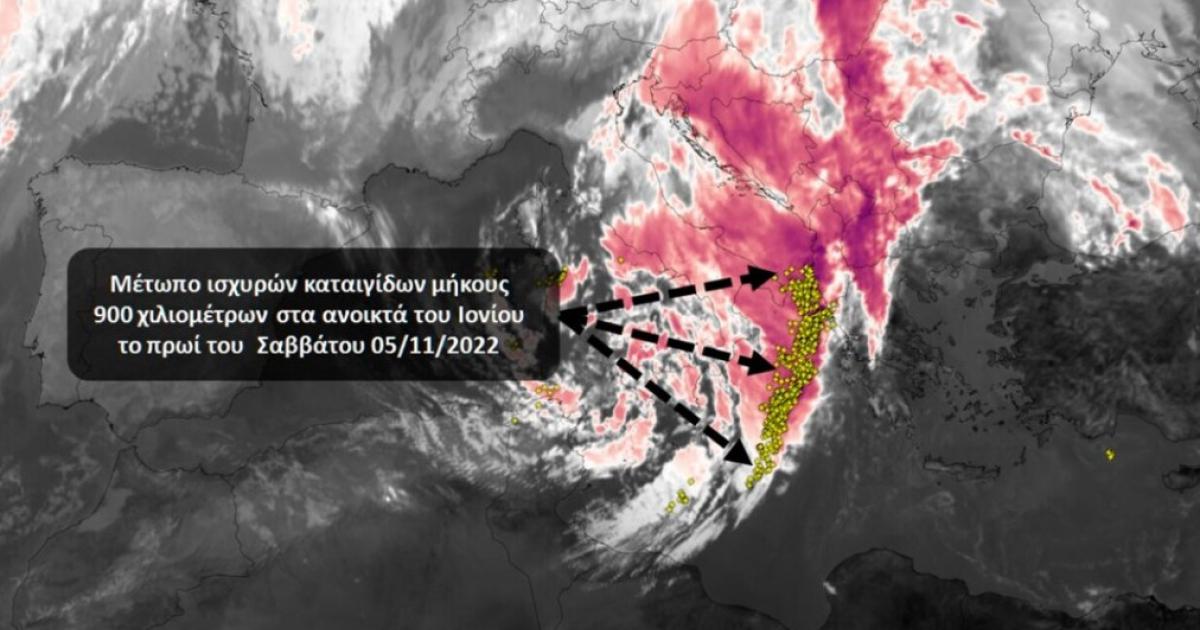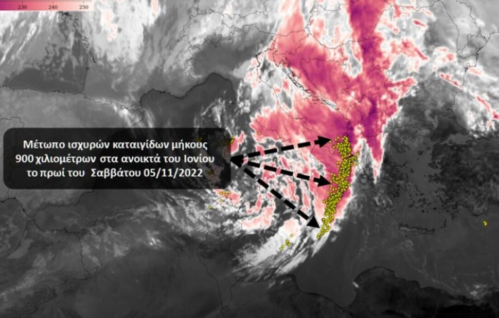 Σήμερα Σάββατο (05-11-2022) τα ισχυρά και κατά τόπους επικίνδυνα καιρικά φαινόμενα που ήδη επηρεάζουν τα βορειοδυτικά (το βόρειο Ιόνιο και την Ήπειρο) από το μεσημέρι και μετά θα επεκταθούν στο νότιο Ιόνιο, τη δυτική Στερεά και τη δυτική Πελοπόννησο. Από το βράδυ τα ισχυρά φαινόμενα θα επεκταθούν ανατολικότερα και θα επηρεάσουν την ανατολική Πελοπόννησο, την κεντρική Στερεά, τη Θεσσαλία, τη δυτική και κεντρική Μακεδονία (συμπεριλαμβανομένης της πόλης της Θεσσαλονίκης) και κατά τη διάρκεια της νύχτας την ανατολική Στερεά (συμπεριλαμβανομένης της Αττικής) και την Εύβοια.