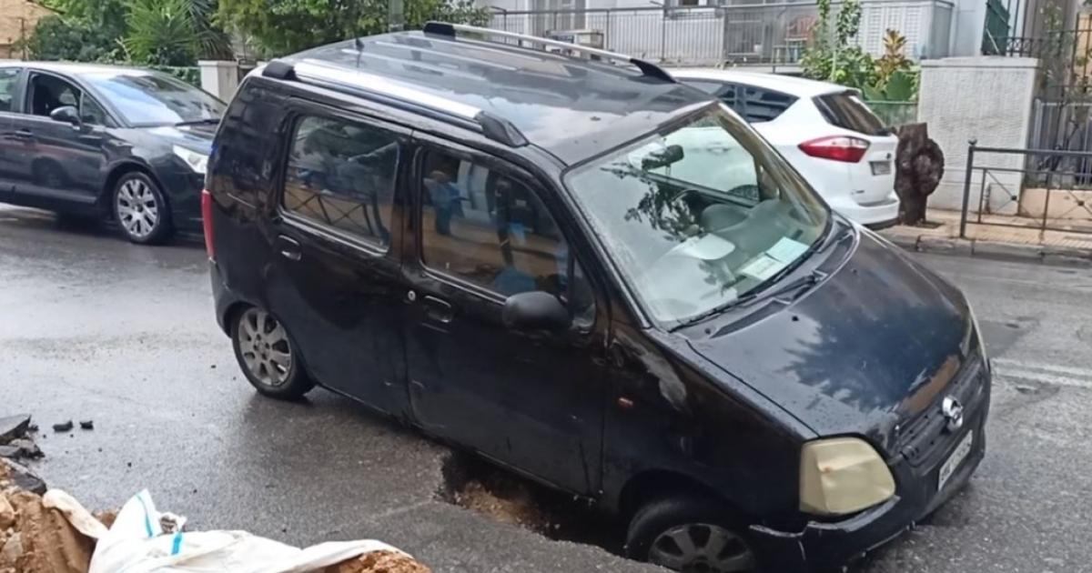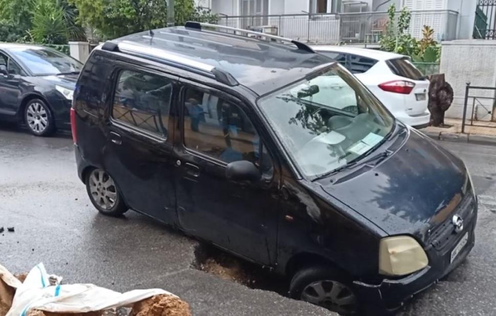 Σε μια μεγάλη τρύπα έπεσε το πρόσθιο τμήμα ενός ΙΧ αυτοκινήτου, κατά τη διάρκεια της κακοκαιρίας που έπληξε την Αττική, στην περιοχή του Αγίου Ελευθερίου, κοντά στον ΗΣΑΠ Άνω Πατήσια.