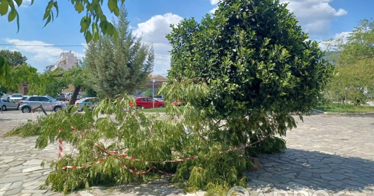 Ο ανεμοστρόβιλος προκάλεσε το σπάσιμο αρκετών κλαδιών από δέντρα, ομπρελών από καταστήματα, καθώς και την πτώση φωτιστικών σωμάτων, όπως φαίνεται και στις φωτογραφίες του TharrosNews.