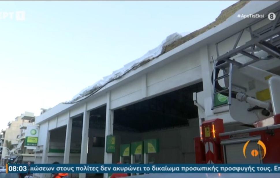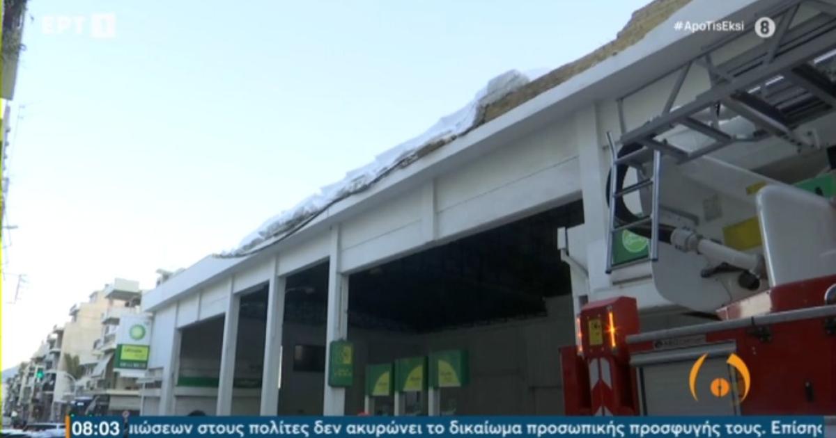 Από το βάρος του χιονιού η στέγη στο βενζινάδικο στην οδό Φορμίωνος κατέρρευσε και στο σημείο έχουν σπεύσει πυροσβέστες, άνδρες της Τροχαίας και εργαζόμενοι του Δήμου Αθηναίων για να μαζέψουν τα μπάζα που έπεσαν στον δρόμο.