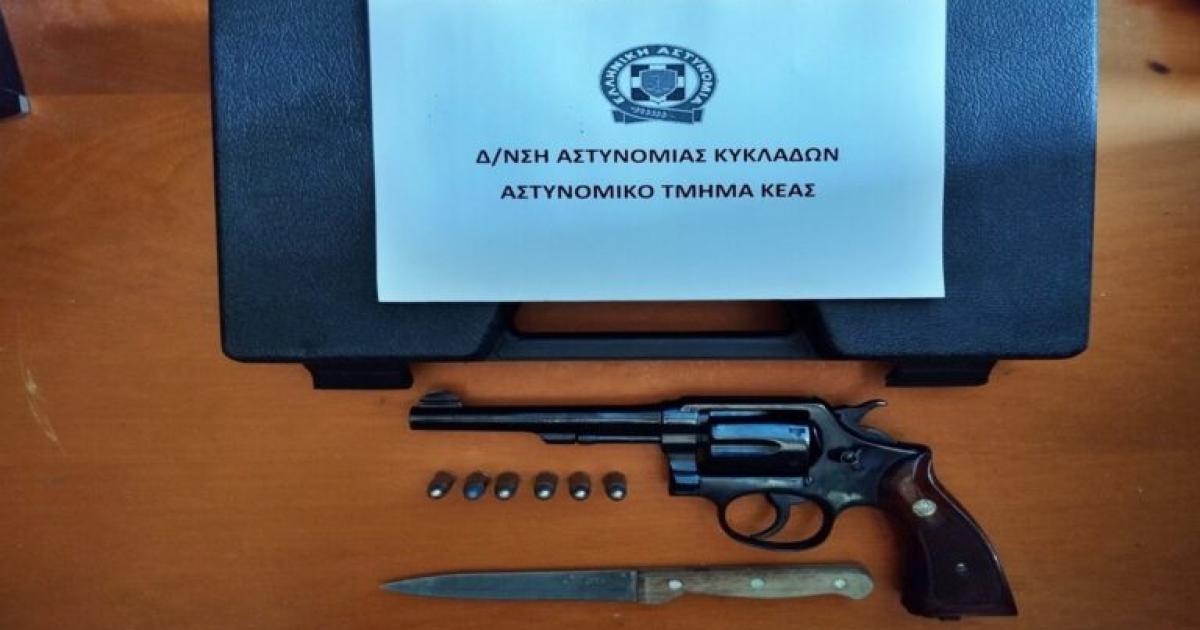 Κατασχέθηκαν περίστροφο με 6 φυσίγγια και μαχαίρι με λάμα 11 εκατοστών.