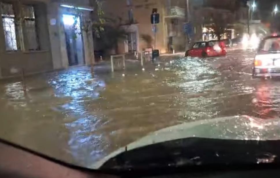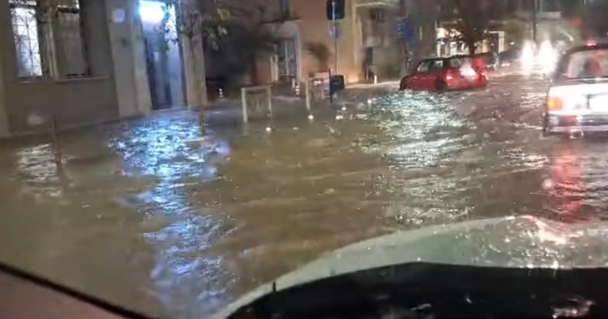 Σε ποτάμια μετατράπηκαν οι δρόμοι του Αργοστολίου στην Κεφαλονιά, έπειτα από καταιγίδα.