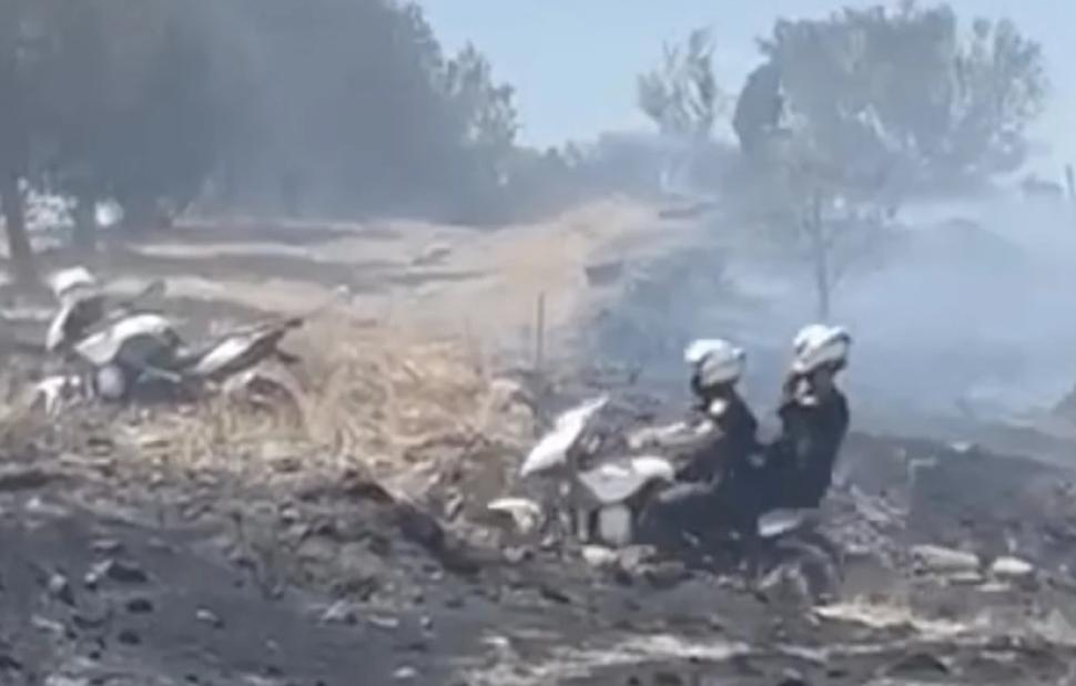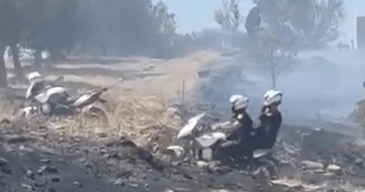 Αστυνομικοί της ομάδας ΔΙ.ΑΣ. αφού απομάκρυναν ηλικιωμένο ζευγάρι από το σπίτι τους στην Κερατέα, προσπαθούν να σβήνουν την φωτιά από την αυλή.