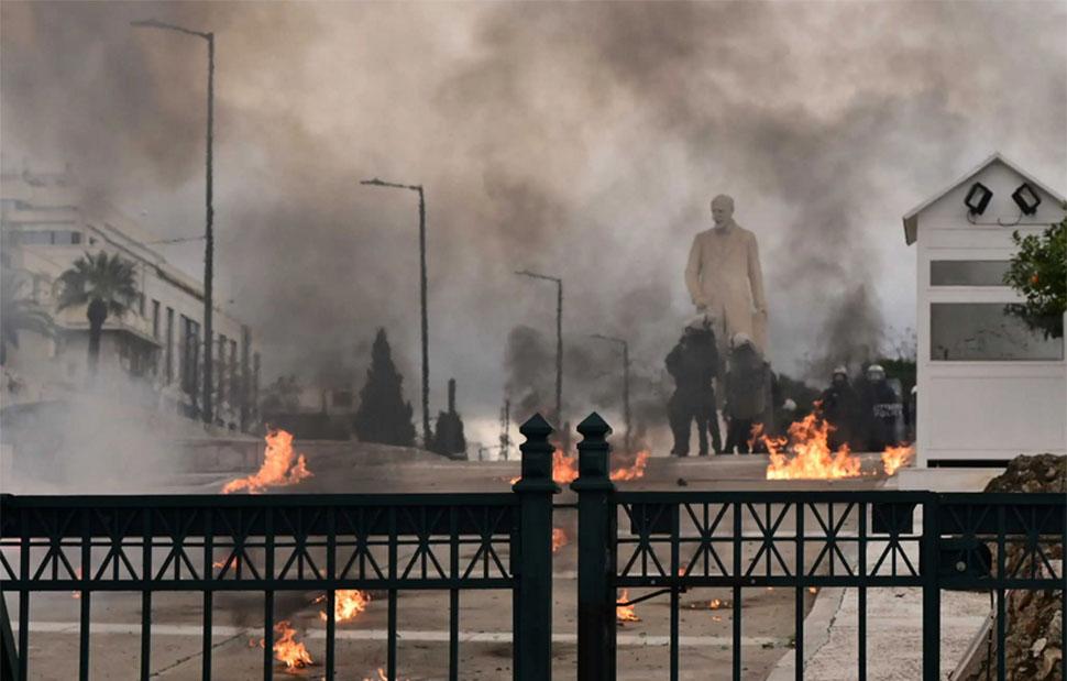 Βόμβες μολότοφ έσκασαν στο προαύλιο της Βουλής, στις δύο εισόδους, όταν ομάδα περίπου 20 ατόμων βγήκε από τον κύριο όγκο των διαδηλωτών και εκσφενδόνισε τα μπουκάλια πάνω από το μνημείο του Άγνωστου Στρατιώτη.