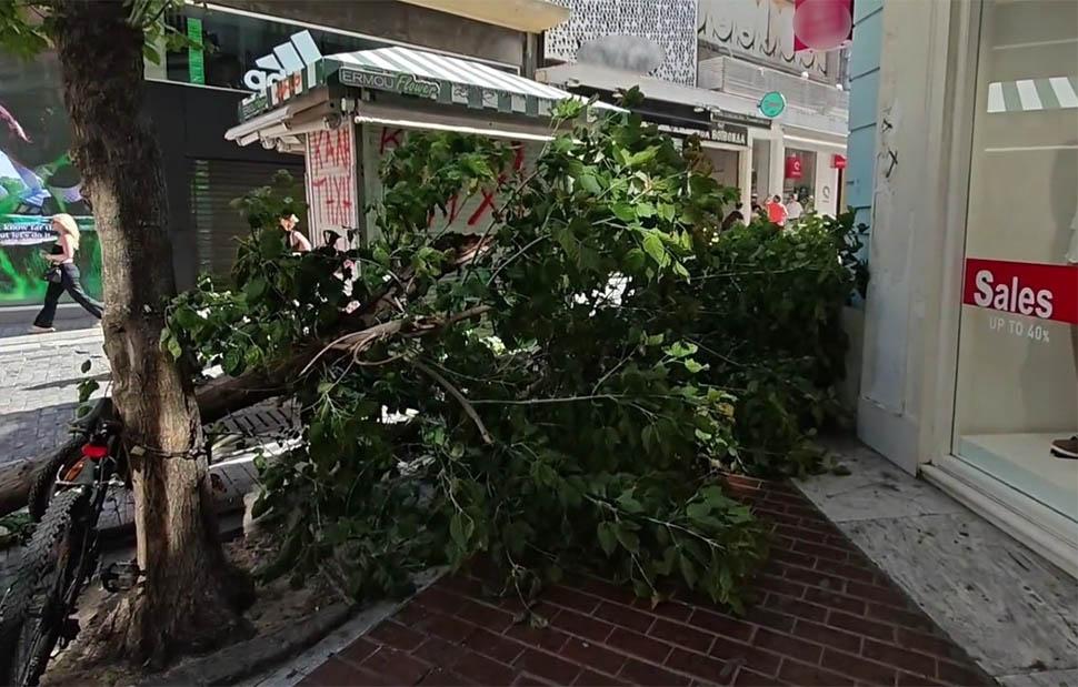 Το περιστατικό έγινε γύρω στις 09:30 το πρωί, την ώρα που πολλοί πολίτες διασχίζουν την Ερμού είτε για τα ψώνια τους είτε για να πάνε στις δουλειές τους. Οι σφοδροί άνεμοι που σφυροκοπούν (και) την Αθήνα, είχαν ως αποτέλεσμα να ρίξουν το δέντρο που βρίσκεται έξω από κατάσταση στη συμβολή της οδού με την Ευαγγελίστρια.