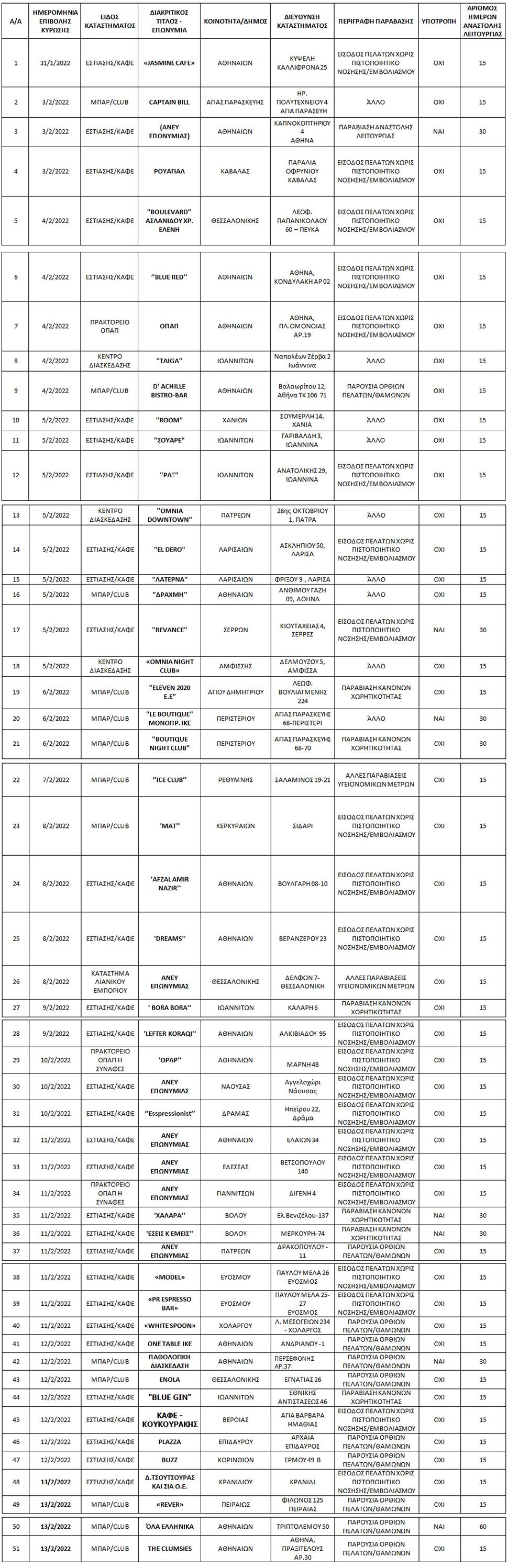 Στη... σέντρα έβγαλε η Γενική Γραμματεία Εμπορίου και Προστασίας Καταναλωτή του Υπουργείου Ανάπτυξης και Επενδύσεων, τις επιχειρήσεις που παραβίασαν τα μέτρα κατά του κορωνοϊού. Πρόκειται κυρίως για επιχειρήσεις εστίασης και διασκέδασης, στις οποίες επιβλήθηκε η διοικητική κύρωση της αναστολής λειτουργίας για την παραβίαση των μέτρων από την Ελληνική Αστυνομία, την Εθνική Αρχή Διαφάνειας και τη Διυπηρεσιακή Μονάδα Ελέγχου της Αγοράς (ΔΙΜΕΑ), στο χρονικό διάστημα από 31-01-2022 έως 13-02-2022.