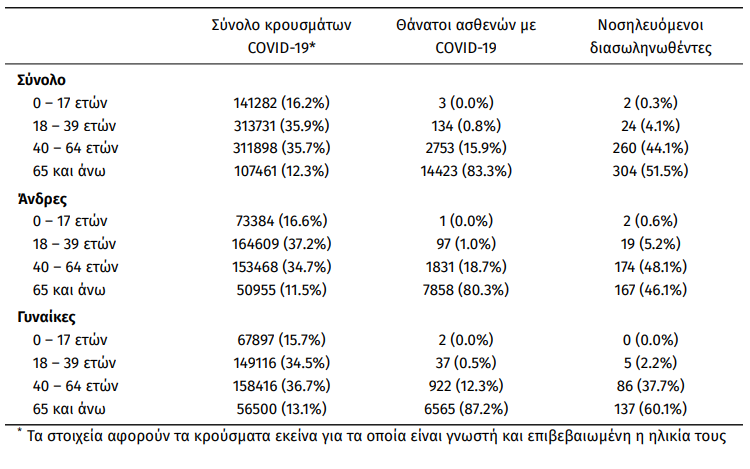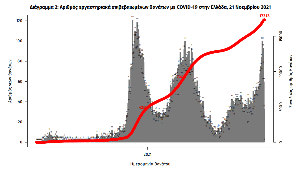 Οι νέοι θάνατοι ασθενών με COVID-19 είναι 76, ενώ από την έναρξη της επιδημίας έχουν καταγραφεί συνολικά 17.313 θάνατοι. Το 95.4% είχε υποκείμενο νόσημα ή/και ηλικία 70 ετών και άνω.